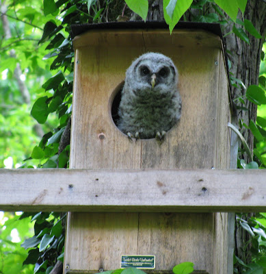 And his sibling was adjacent to the box on a branch!! VERY BRAVE!! Look at the Carolina Wren in the forground of this picture -- talk about brave! She does not want this mean ol owl anywhere near her nest site.